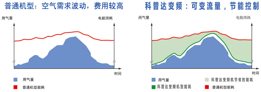 科普達(dá)技術(shù)領(lǐng)先的科普達(dá)變頻空氣壓縮機(jī) 可以精確地滿足用戶的空氣需求。當(dāng)用戶的用氣量降低時(shí),轉(zhuǎn)速調(diào)低,排氣量相應(yīng)減小,同時(shí)能耗也按比例下降。通過(guò)先進(jìn)的變頻技術(shù),大大減少了空壓機(jī)的卸載,使能耗大大下降。