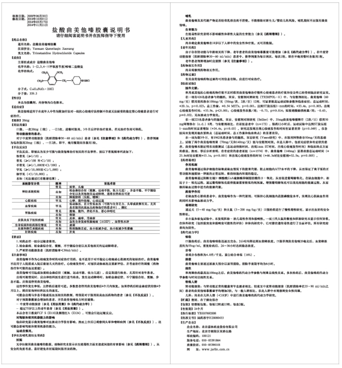 根據(jù)“國家食品藥品監(jiān)督管理總局《關(guān)于修訂鹽酸曲美他嗪片及膠囊說明書的通知》(食藥監(jiān)辦藥化管〔2014〕152號)要求”,我公司對鹽酸曲美他嗪膠囊說明書中的【適應(yīng)癥】、【用法用量】、【不良反應(yīng)】、【禁忌】、【注意事項】、【孕婦及哺乳期婦女用藥】、【兒童用藥】、【老年用藥】、【藥物相互作用】、【藥物過量】、【臨床試驗】、【藥理毒理】和【藥代動力學(xué)】項下相關(guān)內(nèi)容進(jìn)行了修訂,修訂后的說明書已于2014年11月21日獲得北京市食品藥品監(jiān)督管理局備案批準(zhǔn),并在國家食品藥品監(jiān)督管理總局網(wǎng)站進(jìn)行了公示。